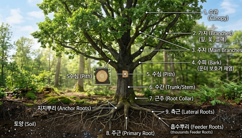 핵심은 간단하다. 나무를 부분의 이름으로만 외우지 말고, 생장과 번식이라는 목적 속에서 읽어야 구조가 살아난다.